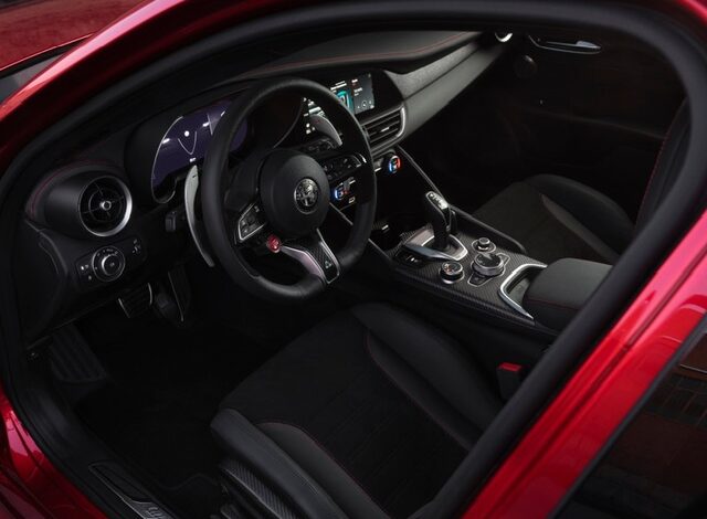 وتحت غطاء المحرك ينبض محرك V6 سعة 2.9 لتر بقوة 520 حصان، الذي يجسّد خلاصة إرث ألفا روميو الرياضي ويعيد الارتباط الفطري بين السائق والسيارة. ويكتمل تميّز الصوت مع نظام العادم Akrapovič المتوافر قياسيًا. وتبرز ألياف الكربون – رمز روح السباقات – في عدة أجزاء مثل الشعار الأمامي، أغطية المرايا، وتطعيمات الكونسول الوسطي والتابلوه، إلى جانب السقف الكربوني المكشوف الذي يمنح السيارة حضورًا تقنيًا وجرأة واضحة. كما يأتي نظام المكابح السيراميكية الكربونية بشكل قياسي، والذي يوفر أداء كبح استثنائيًا مع لمسة جمالية متقنة من خلال شعار ألفا روميو الأحمر على الكاليبر المصقول.
