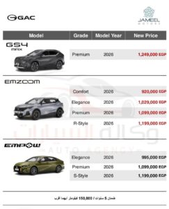 وفي هذا السياق، أعلنت جميل موتورز عن تقديم تخفيضات جديدة على طرازGS3 Emzoom، والذي يتوافر في السوق المصري لموديلات عام ٢٠٢٦ بأربع فئات تجهيزية هي ComfortوElegance و PremiumوR-Style، حيث تبدأ أسعار الفئات بعد التحديث من ٩٢٠.٠٠٠ جنيه مصري لفئة Comfort ،و١.٠٢٩.٠٠٠ جنيه مصري لفئة Elegance، و١.٠٩٩.٠٠٠ جنيه مصري لفئةPremium، و١.١٩٩.٠٠٠ جنيه مصري لفئة R-Style، كما شملت التحديثات السعرية طراز GS4 MAX لموديل عام ٢٠٢٦، والذي يتوافر بفئة تجهيزية واحدة، بسعر ١.٢٤٩.٠٠٠ جنيه مصري.