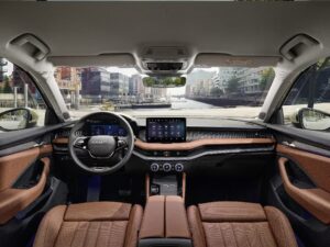 وتحتوي المقصورة الداخلية لسيارة “Škoda Superb 2025” على مجموعة متكاملة من التجهيزات التي تعزز من الراحة والرفاهية، تشمل: إضاءة داخلية محيطة مع إضاءة سفلية أمامية وخلفية، مقاعد كهربائية للسائق والراكب الأمامي مزودة بدعم قطني وخاصية التدفئة المستقلة، ونظام تهوية ومساج للمقاعد الأمامية مع خاصية الذاكرة. كما يتوفر عجلة قيادة جلدية رياضية متعددة الوظائف مزودة بذراع لتغيير السرعة، وقفل أمان كهربائي للأطفال، إلى جانب شمّاسات أمامية مزودة بمرايا مضيئة. وتأتي السيارة بمساحة تخزين تبلغ 645 لتراً، ترتفع لتصل إلى 1,795 لتراً كحد أقصى عند طي المقاعد الخلفية، ما يوفر مرونة كبيرة سواء للاستخدام اليومي أو للرحلات الطويلة.